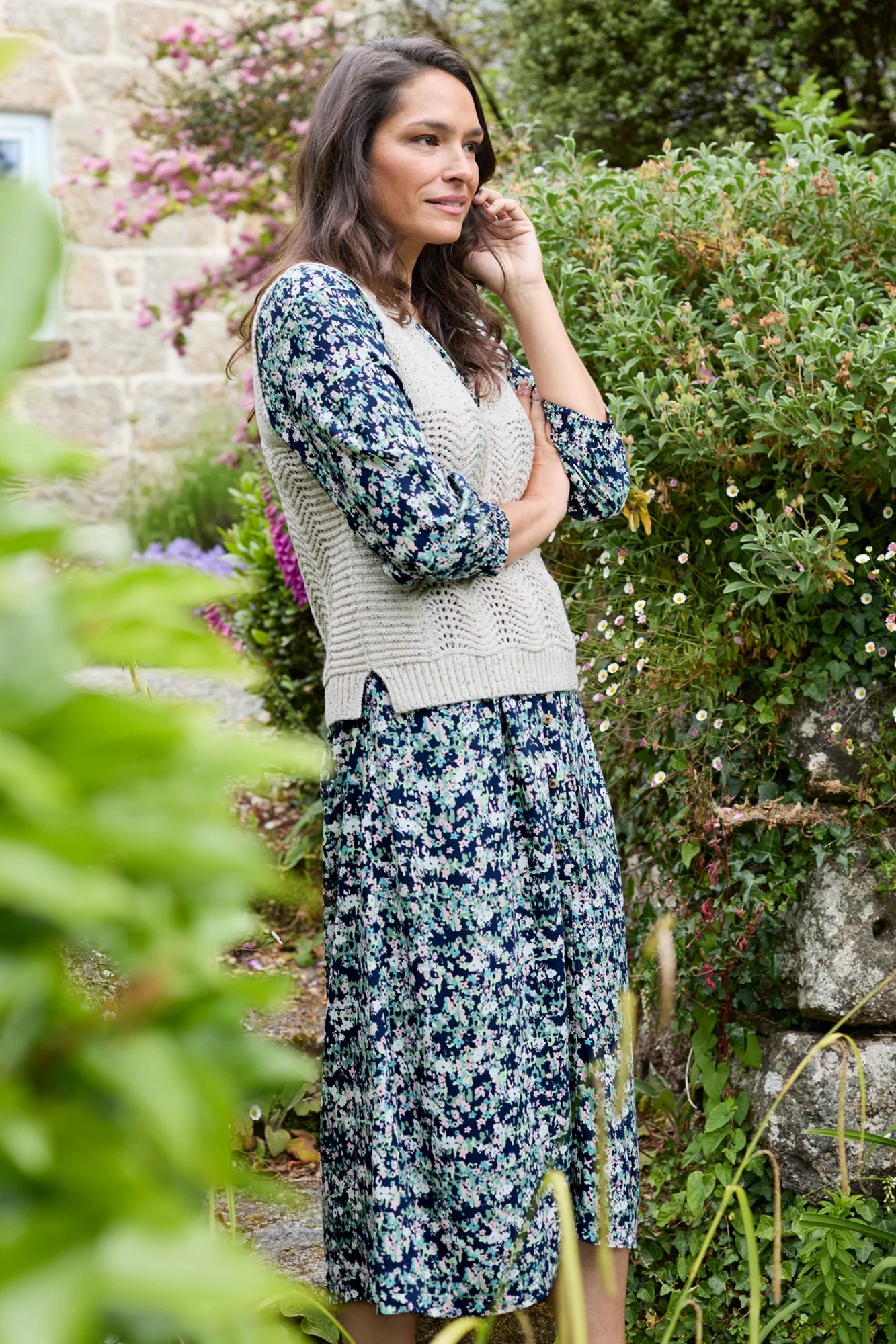 The Aelia is a cotton-rich knitted tank in oatmeal. Woven from a flecked ‘neppy’ yarn giving it a beautifully soft level of colour.