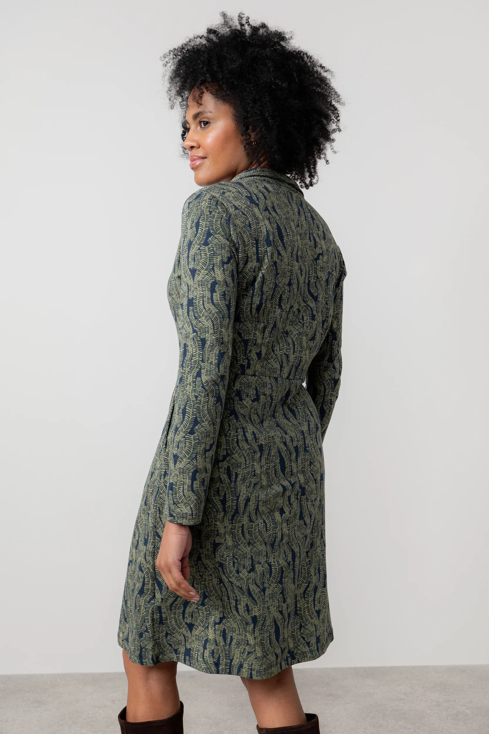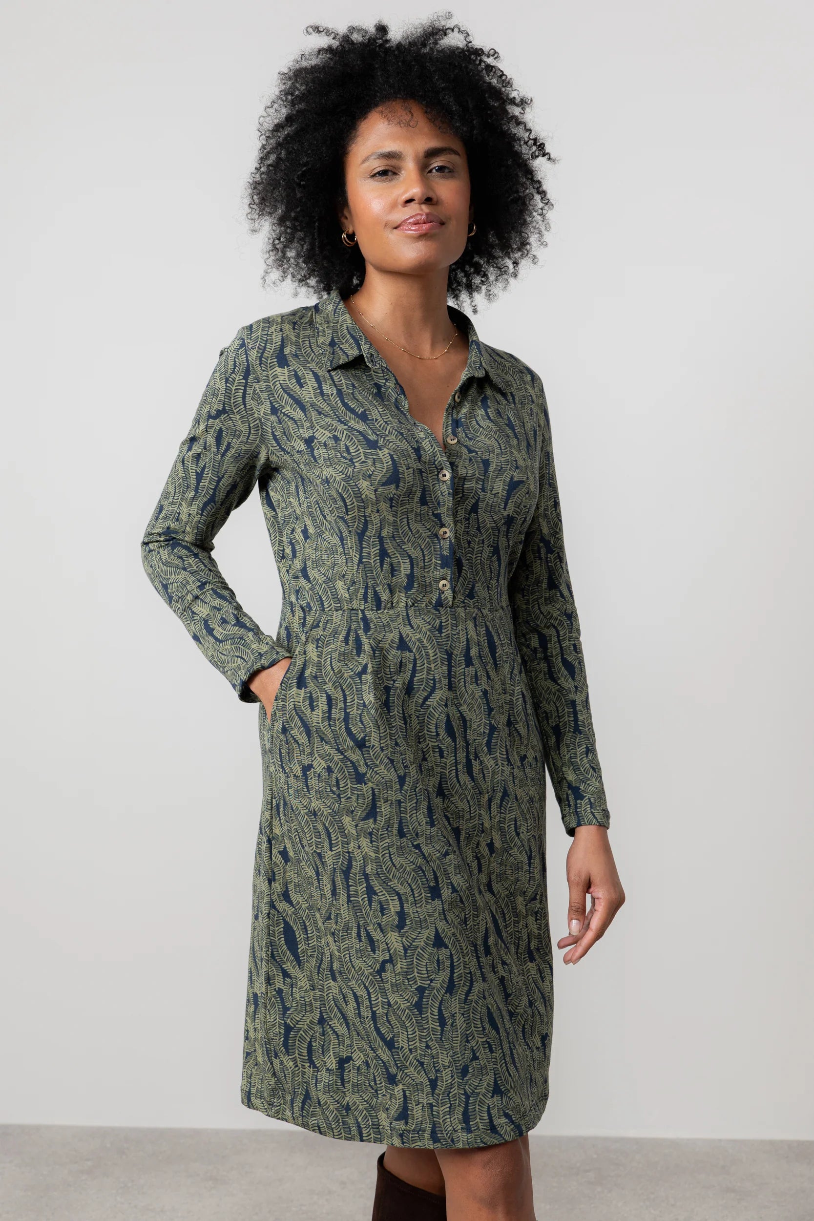 Dressing made easy with this soft organic cotton shirt dress. In a bespoke print, tailored to skim the body with flattering pleats at the waist seam and all-important pockets.