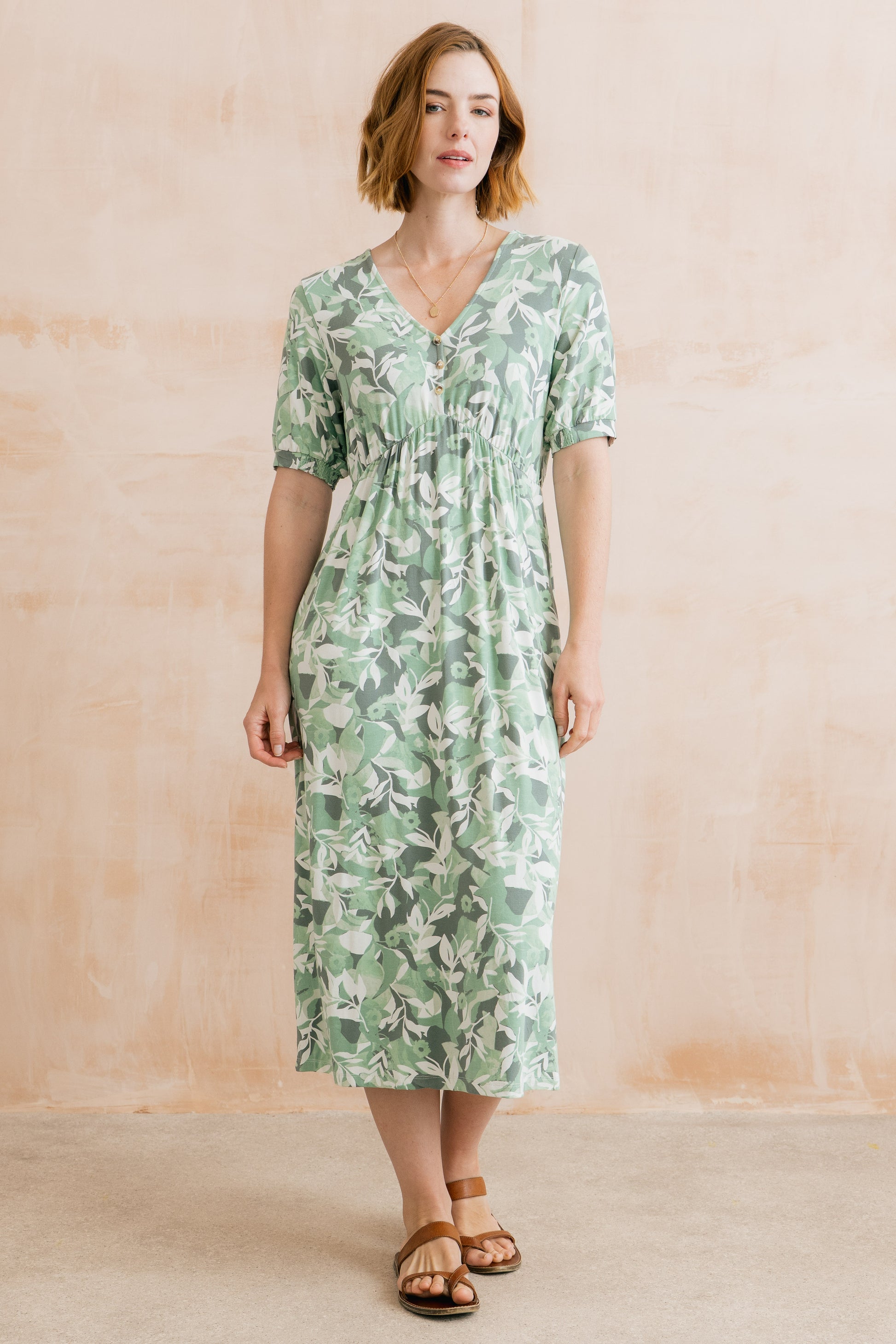 A stunning, soft, stretch Ecovero™ viscose jersey midi dress is always a summer favourite. The flattering curved empire bustline has gather to ensure the fabric of the skirt skims the body. The short sleeves finish with half shirred cuffs and all important pockets give a practical edge.