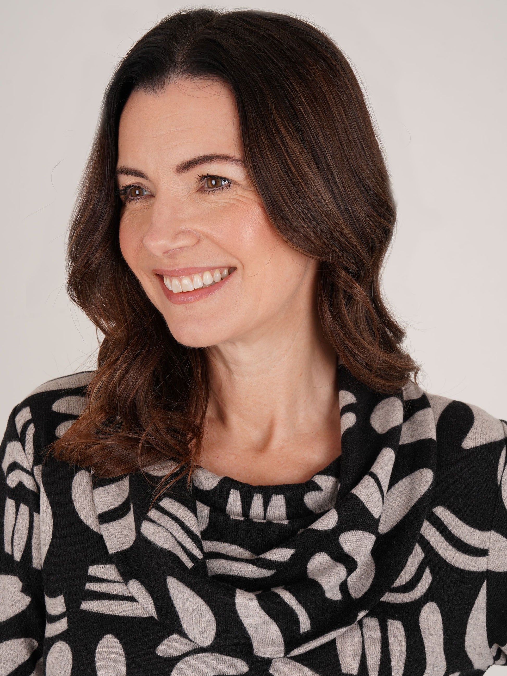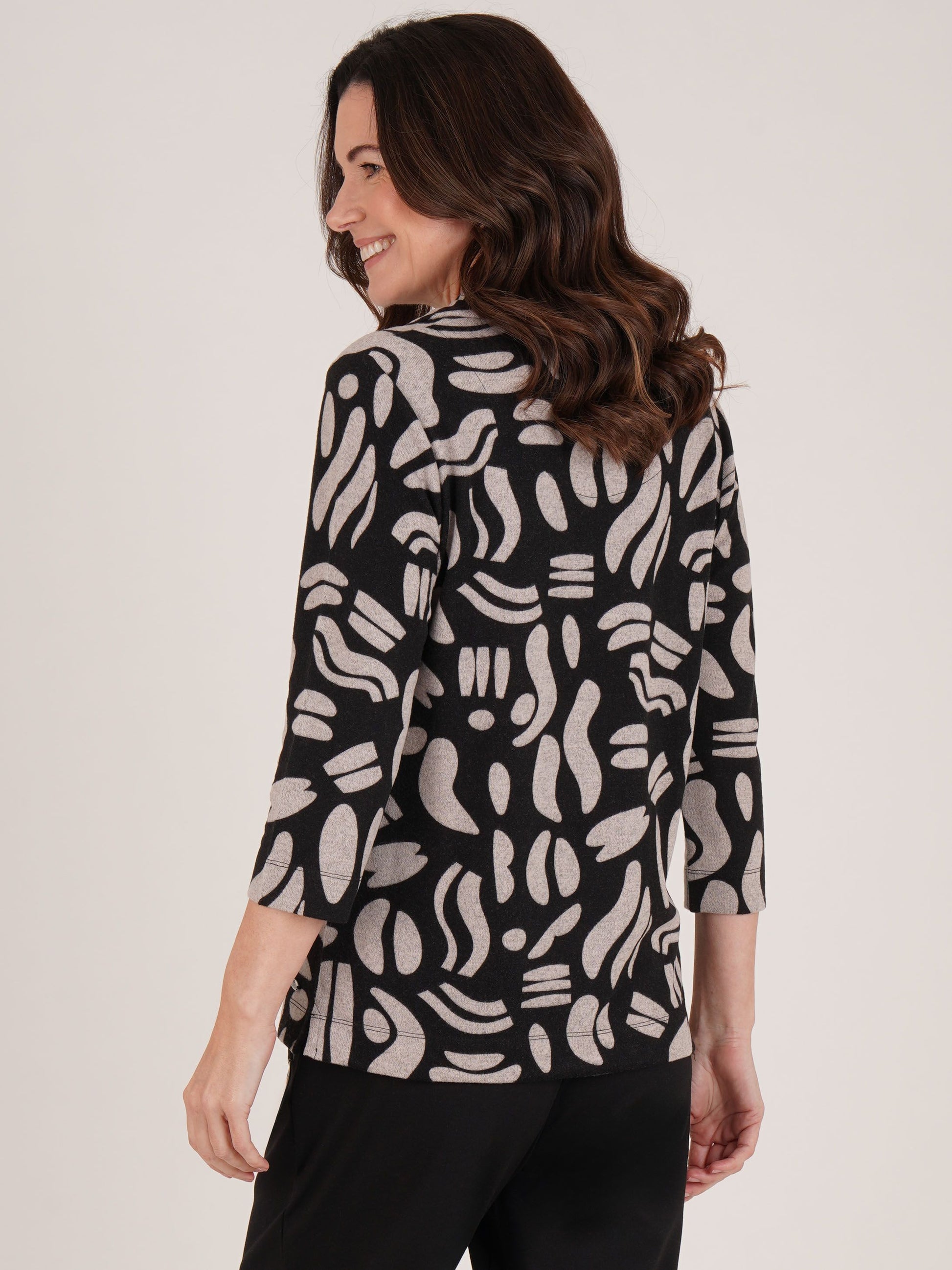 Elevate your style with this bold cowl neck top featuring an abstract black and stone print. With three quarter length sleeves and a soft fabric, it's perfect for effortless layering and all-day comfort.