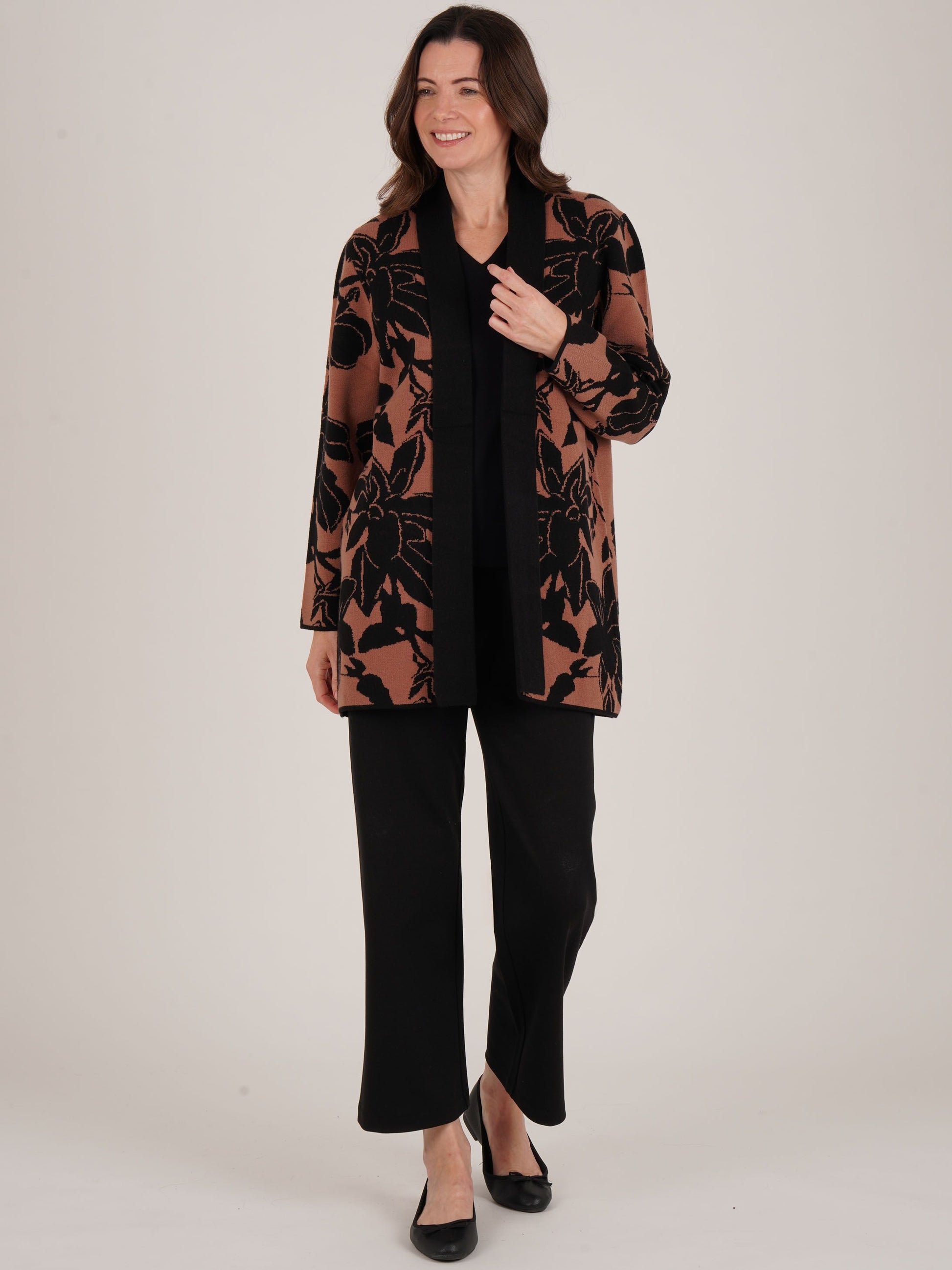 A versatile cardigan designed with a relaxed silhouette in a lovely camel colour and floral jacquard, this is soon to become your favourite layering piece that looks great over both jeans and dresses.