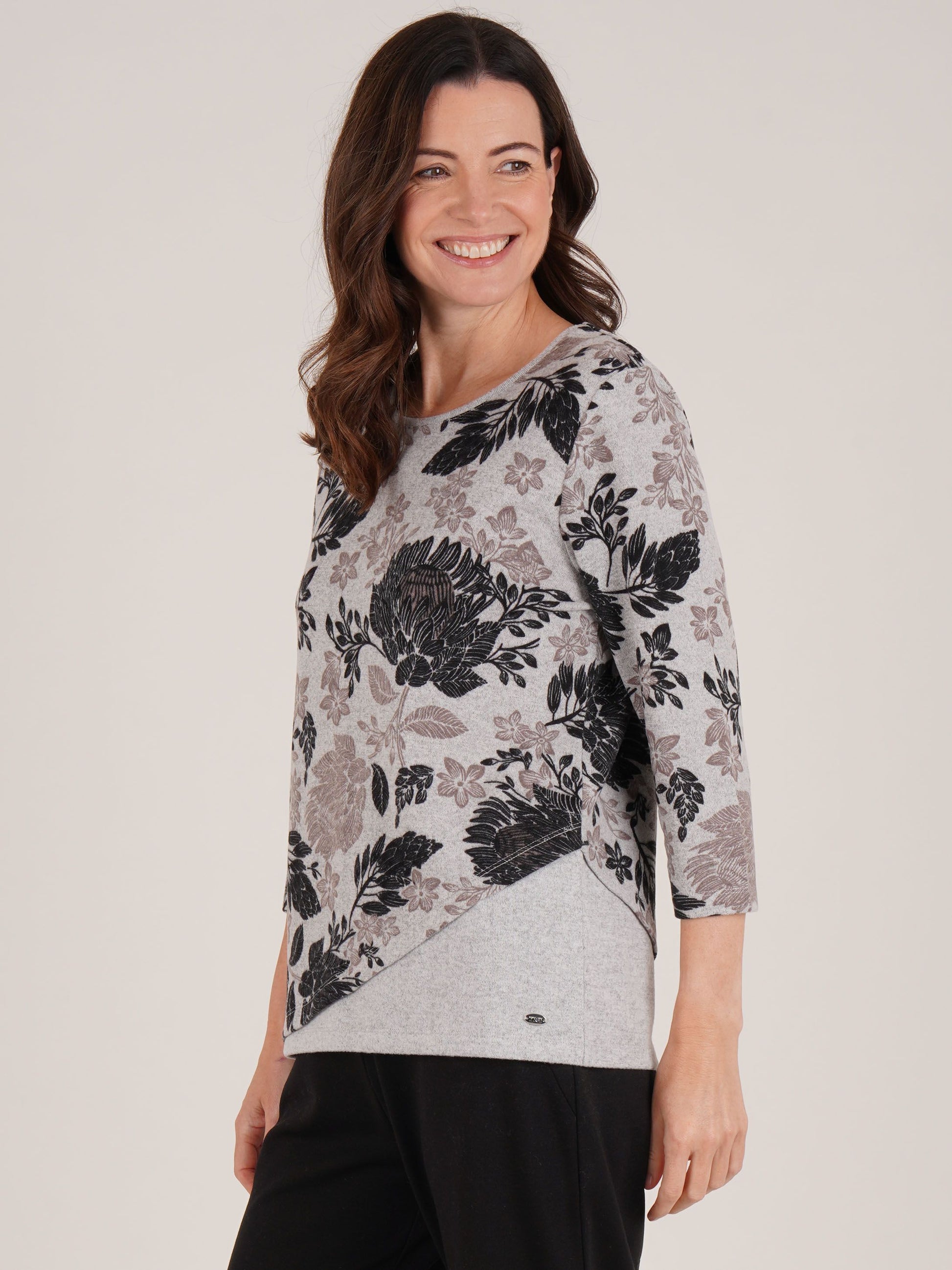 This curved hem top features a delicate floral print in soft taupe tones with a flattering scoop neck and 3/4 sleeves. The asymmetrical hem adds a stylish twist to this easy, everyday essential.
