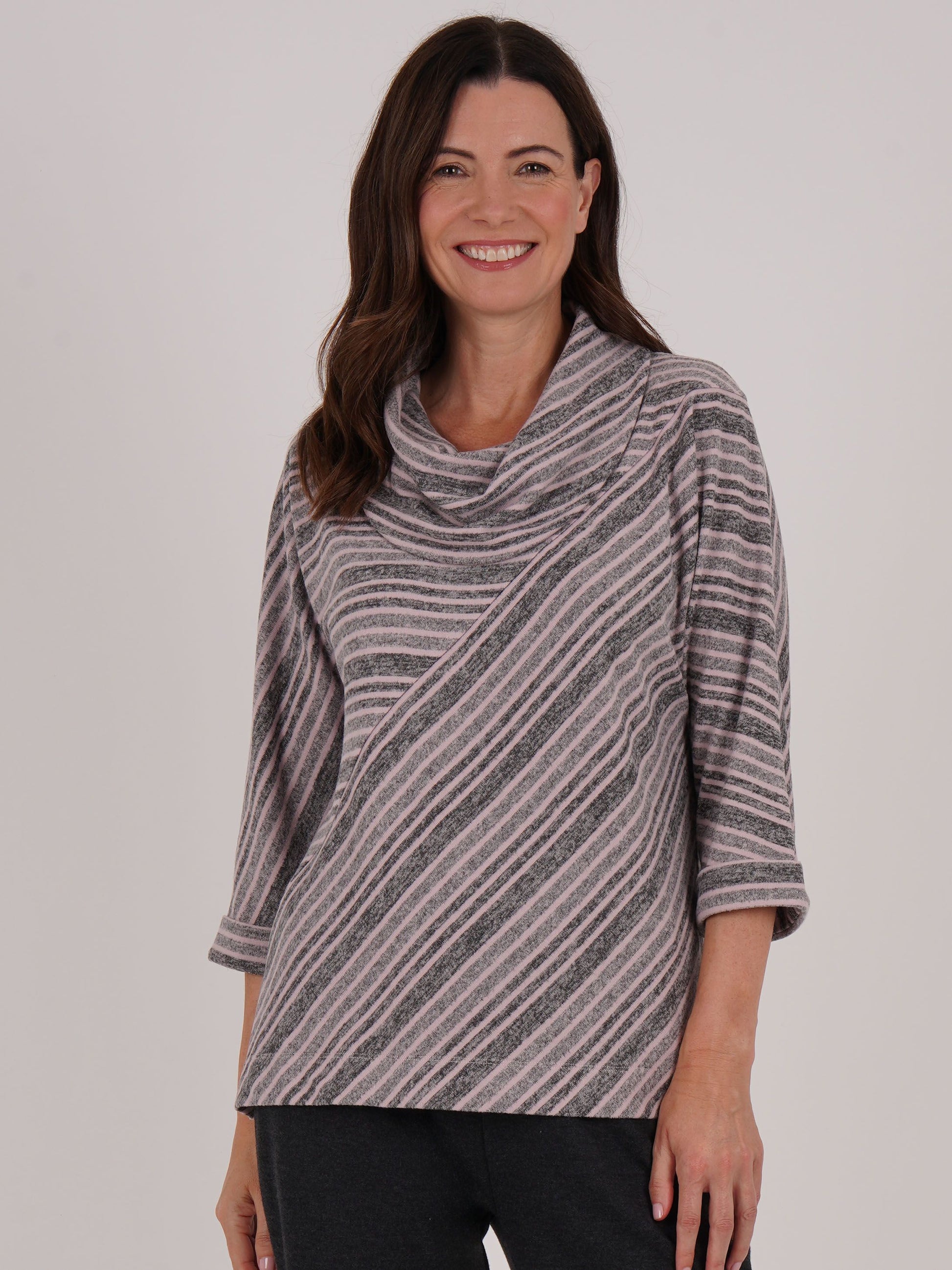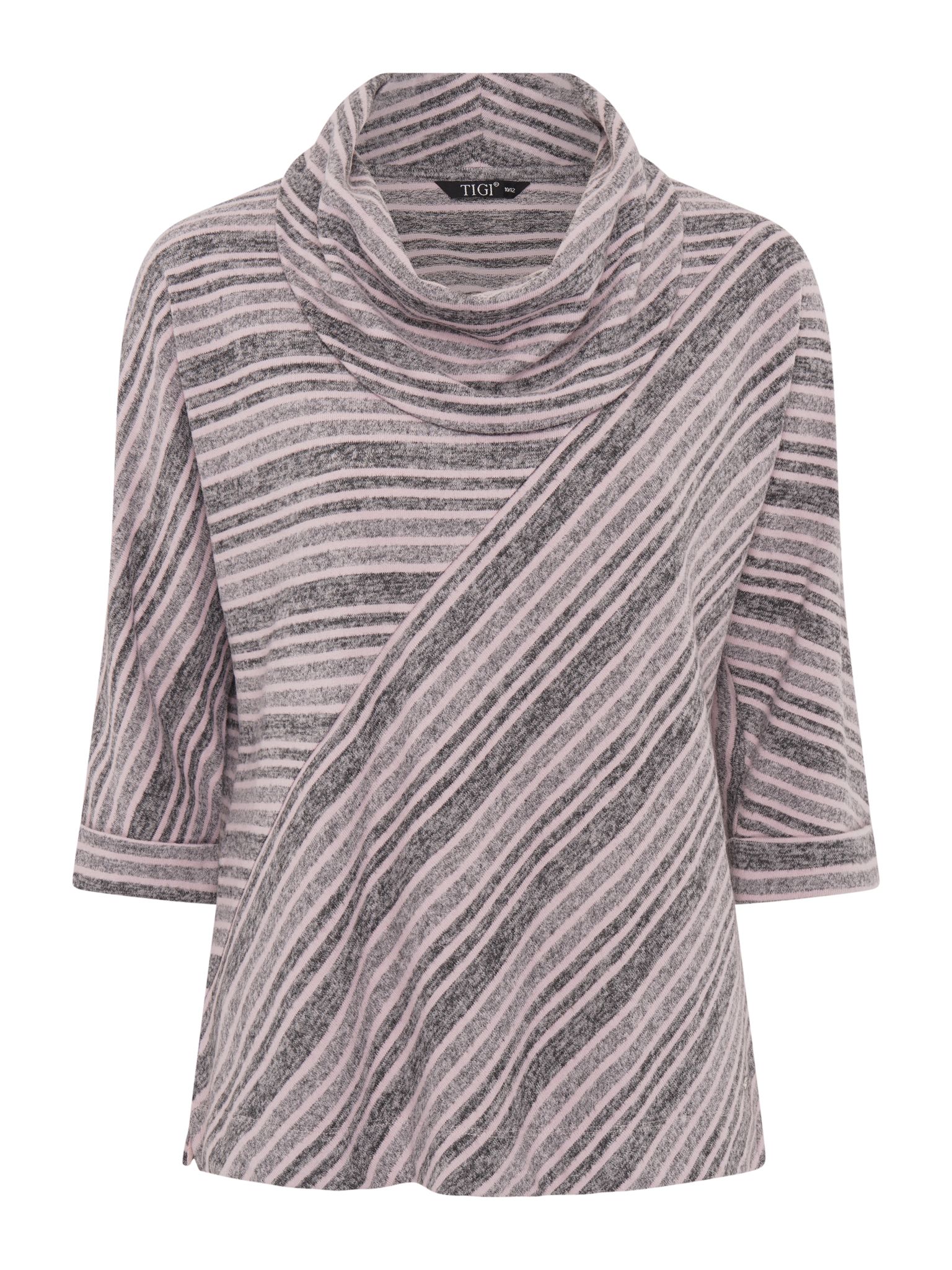 Stand out in the crowd with our rose melange stripe print top. Showcases a cross seam panel at the front, Cowl-neck, three quarter batwing sleeves with rolled up cuff and metal tab at the hem.