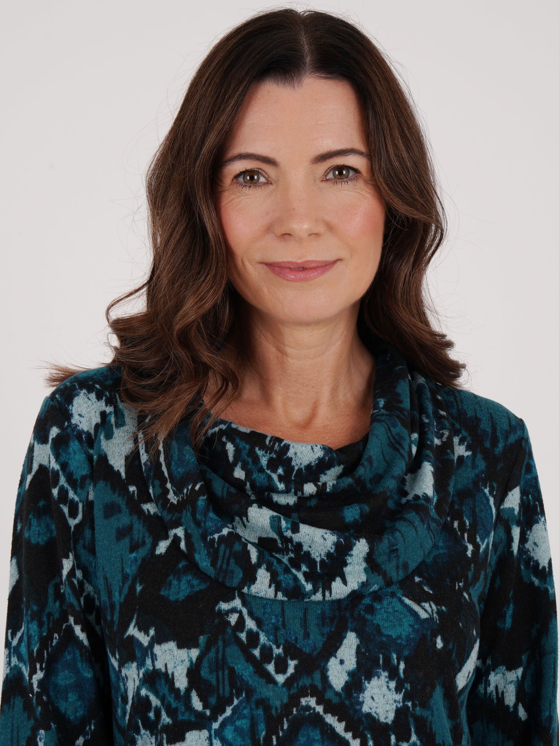 The Tribal Ikat all-over Print Cowl Neck Top combines style and comfort, featuring a stylish cowl neck design that drapes beautifully. Crafted from soft brushed jersey, with long sleeves.