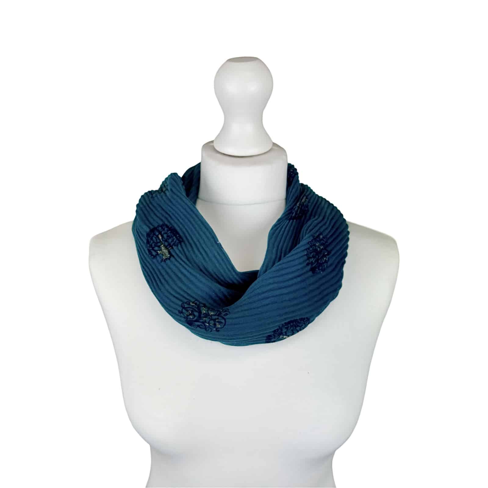 Lightweight, glittery tree print crinkle scarf/snood with a neat magnetic clasp. Easy to put on and a simple way to add extra style and warmth to any outfit.